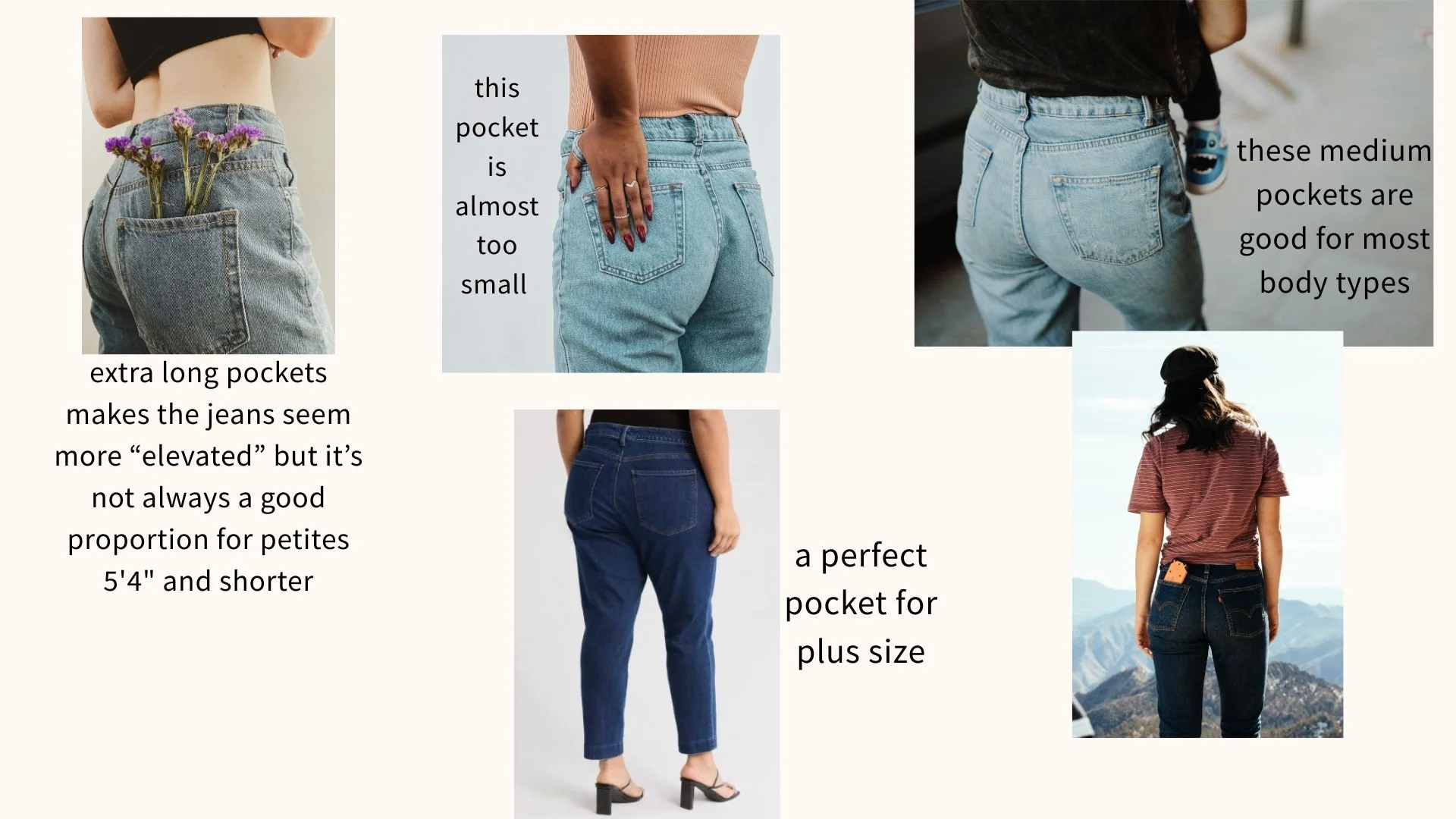There’s a little-known secret when buying jeans, and that’s pocket placement. The pockets on the back of your jeans say a lot about the type of jeans you’re wearing, but more importantly, do they match your booty type? Larger pockets tend to be on more upscale jeans, but also, does it match the size of your booty? Sometimes I’ve noticed the pockets are too close together or too far apart. Look in a 3-way mirror when trying jeans on. There have been times when I try on a pair of jeans and then look at the back. I’ll take a pass on the jeans if the pockets aren’t flattering on me. When in doubt? Work with a stylist! One of the first things I do with a new client is review the jeans. Are they flattering in the front AND the back? See some photos below for a little more inspiration.